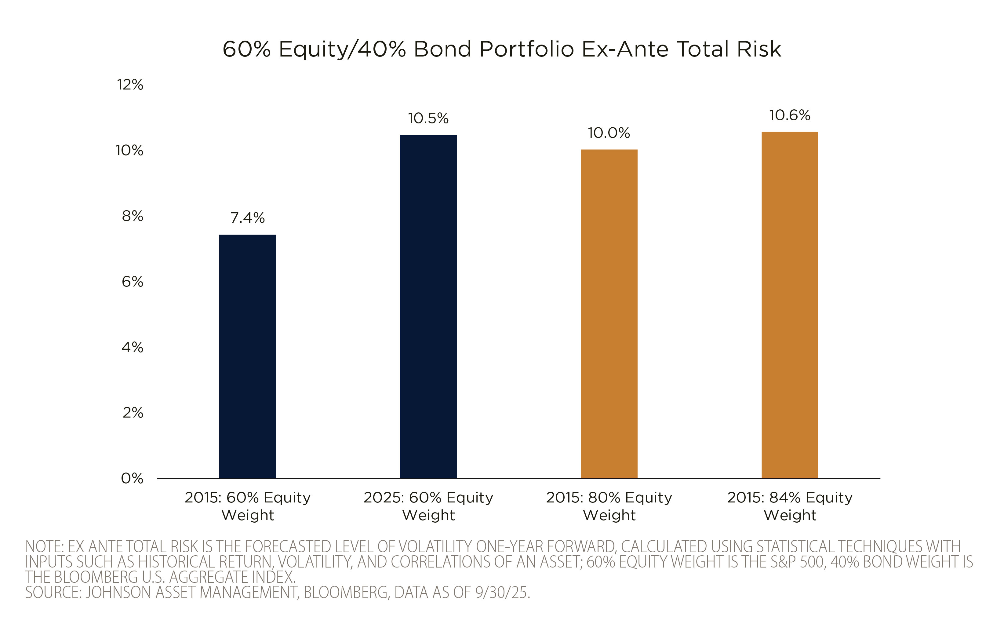 Most discussions of the S&P 500 acknowledge that the extreme concentration in the largest stocks in the index has increased the overall level of risk. We wanted to understand how that translates into client portfolios. Using statistical methods to calculate ex-ante total risk, a measure of expected volatility, we compared a standard 60% equity 40% bond portfolio using the 2015 S&P 500 index composition with the same portfolio today. The results show a 3% increase in expected volatility for a 60/40 portfolio today vs. 2015. Said differently, a 60% equity 40% bond portfolio using the S&P 500 today contains the same expected volatility as an 84% equity 16% bond portfolio in 2015. For asset allocators, it is important to understand how changes to index composition over the past decade have impacted the risk characteristics of client portfolios.